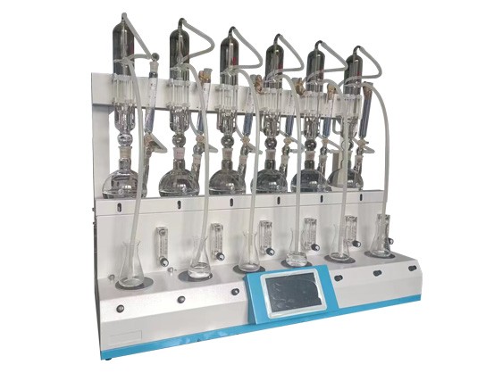 二氧化硫殘留量測定儀整合加熱、蒸餾、冷卻循環、氮吹、磁力攪拌、接收及滴定裝置等功能為一體。單次可處理1-6位樣品,提高實驗效率。